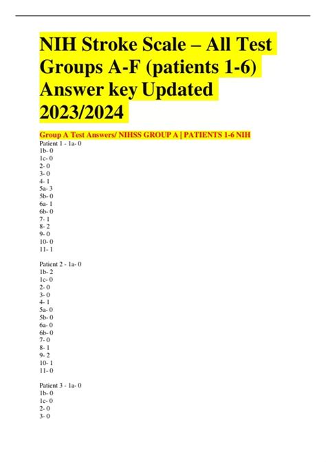 In conclusion, the NIH Stroke Scale Group A Answer Key emerges as a pivotal tool in healthcare, providing a systematic and standardized approach to evaluating stroke severity. Its application extends beyond assessment, influencing treatment decisions and shaping patient-centric care plans. As healthcare professionals continue to navigate the complexities of neurological disorders, the NIH Stroke Scale remains an indispensable asset in ensuring accurate, informed, and tailored interventions for optimal patient outcomes.